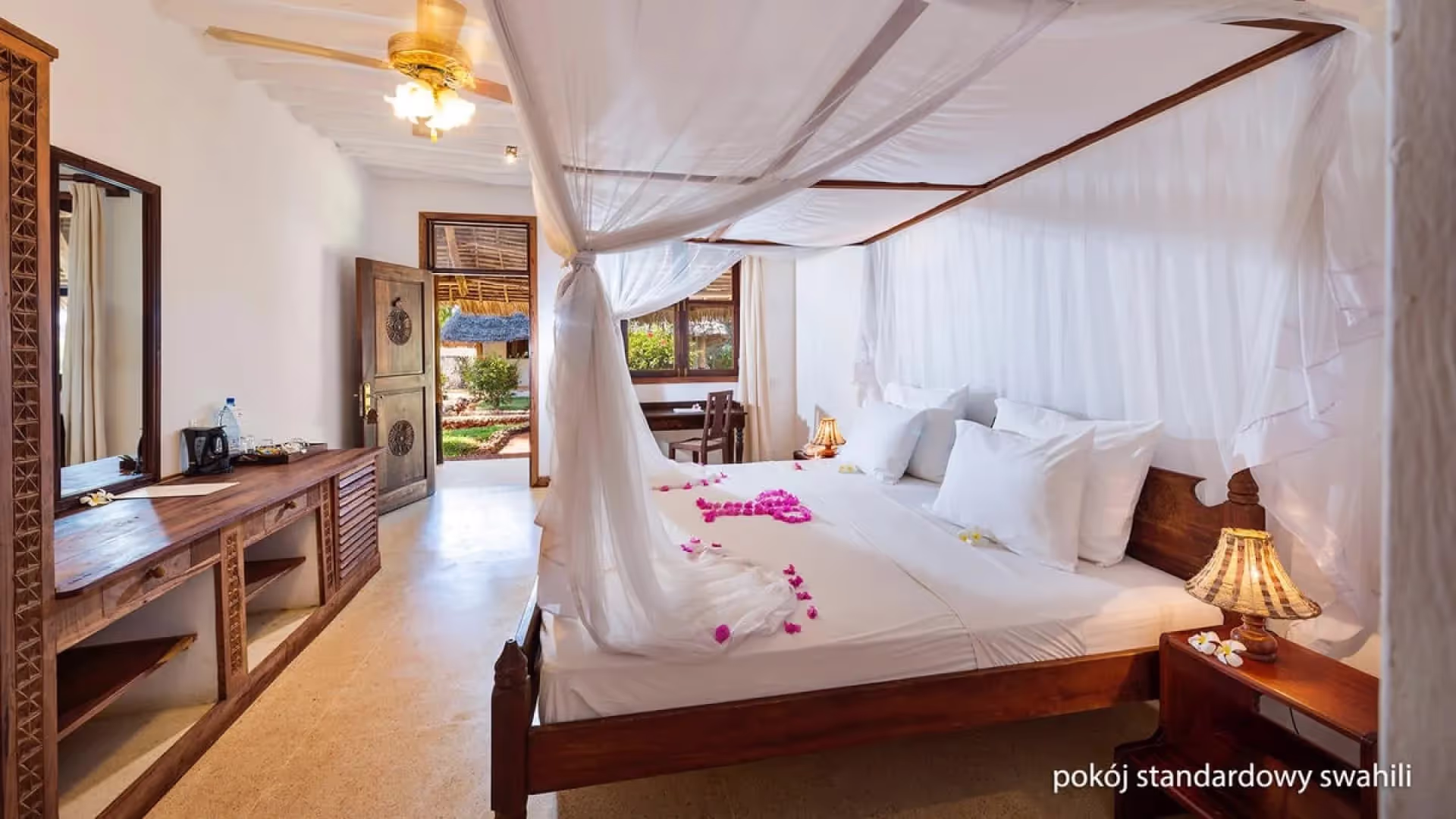 'Biała plaża z piaskiem jak puder, intensywnie błękitny ocean, tropikalny ogród z palmami i bugenwillami, zapach słynnych zanzibarskich przypraw to tylko wstęp do niezapomnianych wakacji. Kameralny, o przyjemnej formule klubowej, jest znakomitym miejscem na rodzinne wakacje. Wspólna zabawa podczas zajęć sportowych i programów rozrywkowych, znakomita atmosfera, którą tworzą zadowoleni Goście z całego świata i przemiła obsługa pozwalają w pełni cieszyć się afrykańskim słońcem. Niskie budynki hotelu i wygodne pokoje w bungalowach są utrzymane w pełnym elegancji i prostoty lokalnym stylu. Hotel jest znany z dobrej kuchni, koniecznie należy skosztować egzotycznych potraw lokalnej kuchni suahili. W tym miejscu zakochasz się od pierwszego wejrzenia, bo „mapenzi” w języku suahili znaczy „miłość”.'