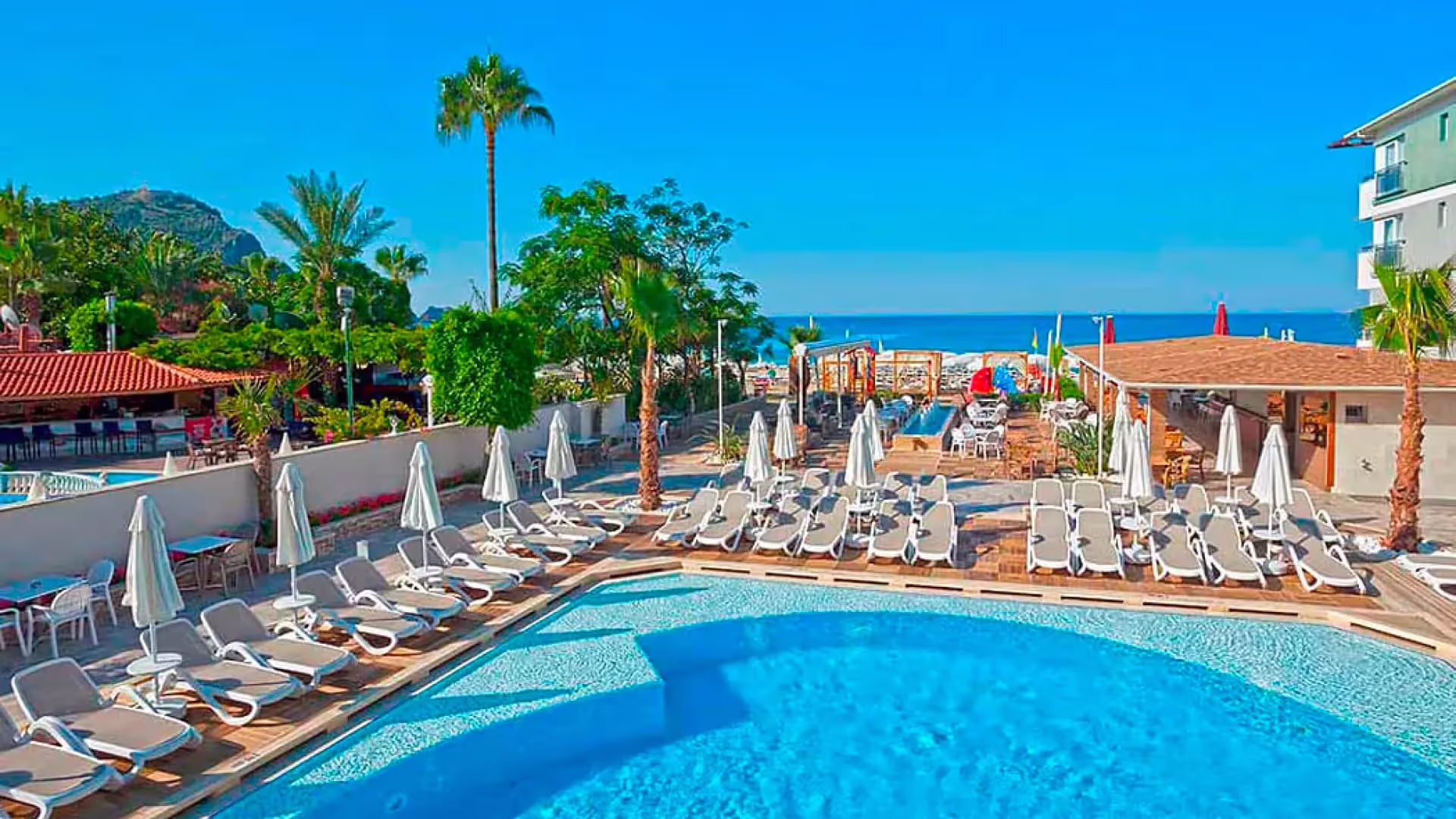 Jako jeden z nielicznych hoteli położony jest bezpośrednio na szerokiej, piaszczystej i niewątpliwie najpiękniejszej plaży na Riwierze Tureckiej - plaży Kleopatry. Leżaki i parasole na plaży dostępne bezpłatnie.